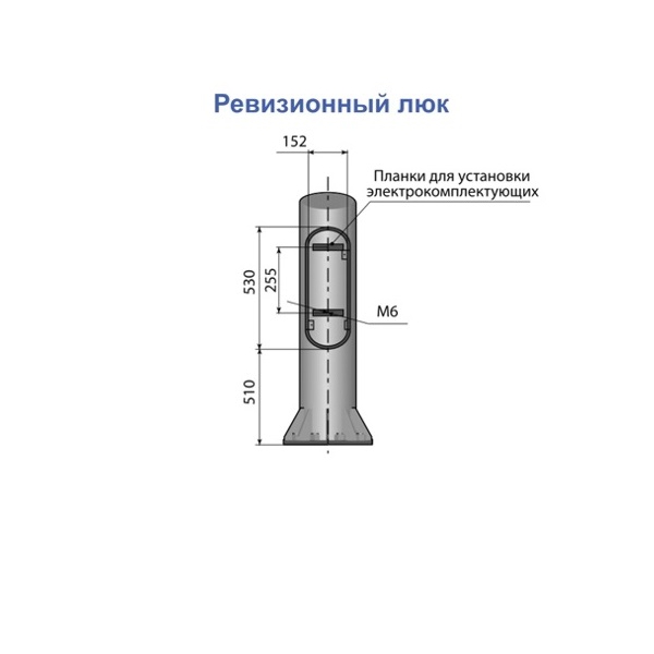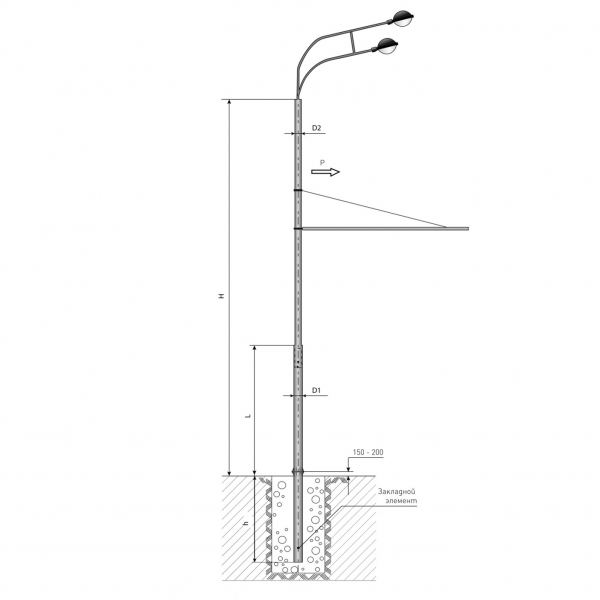 Опоры серии ТФ изготавливаются из высококачественного трубного проката по ГОСТ 10704-81 или ГОСТ 8732-78. У данных опор возможен как воздушный, так и подземный подвод кабеля. На опору стандартно устанавливаются кронштейны со светильниками. При подземном подводе питающих кабелей (через окна в закладном элементе) предусмотрены ревизионные лючки с планками установки комплектующих и точка заземления (болт М10). При воздушном подводе питания точка заземления выполняется на расстоянии 900...1000 мм ниже верхнего обреза опоры.