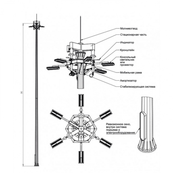 Высота высокомачтовых опор МГФ 50 метров. Их грузоподъёмность составляет до 800 кг. Количество прожекторов в каждой опоре — до 12 штук.