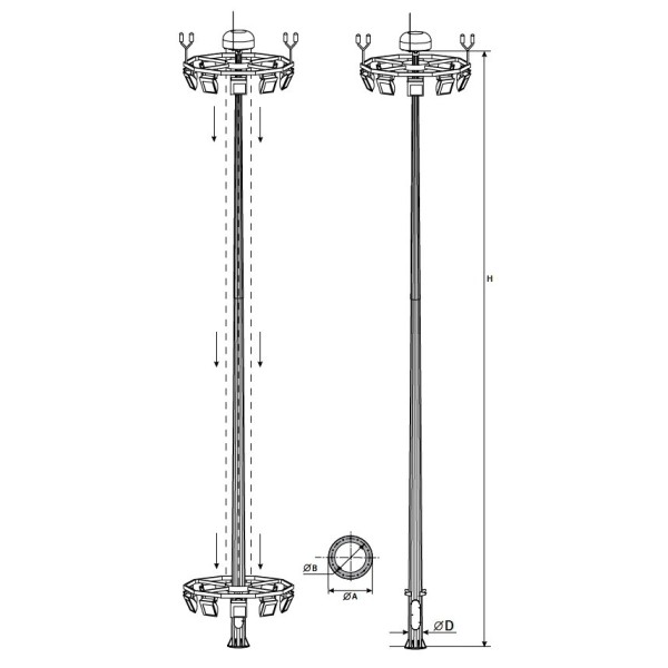 Высокомачтовые опоры освещения, предназначенные для монтажа большого количества светильников (до 12) на высоте, позволяющей увеличить их продуктивность и площадь охвата. Опоры ВМО-35-В заменяют собой сразу несколько стандартных опор освещения, что позволяет полностью окупить их увеличенную стоимость, связанную не только с большой металлоемкостью, но и со сложной организацией конструкций. При этом такие металлоконструкции отличаются оптимальным для своих габаритов весом, не создают излишней нагрузки на грунт, могут быть использованы для подземного подвода кабельной системы, что позволяет отказаться от протягивания дополнительных проводов. Системы используются на стадионах, на промышленных площадках и т.д. Их гармоничный дизайн и современное исполнение, а также возможность обслуживания без привлечения габаритной спецтехники, которой часто требуется специальный подъезд, позволяют использовать их при обустройстве жилых комплексов.
